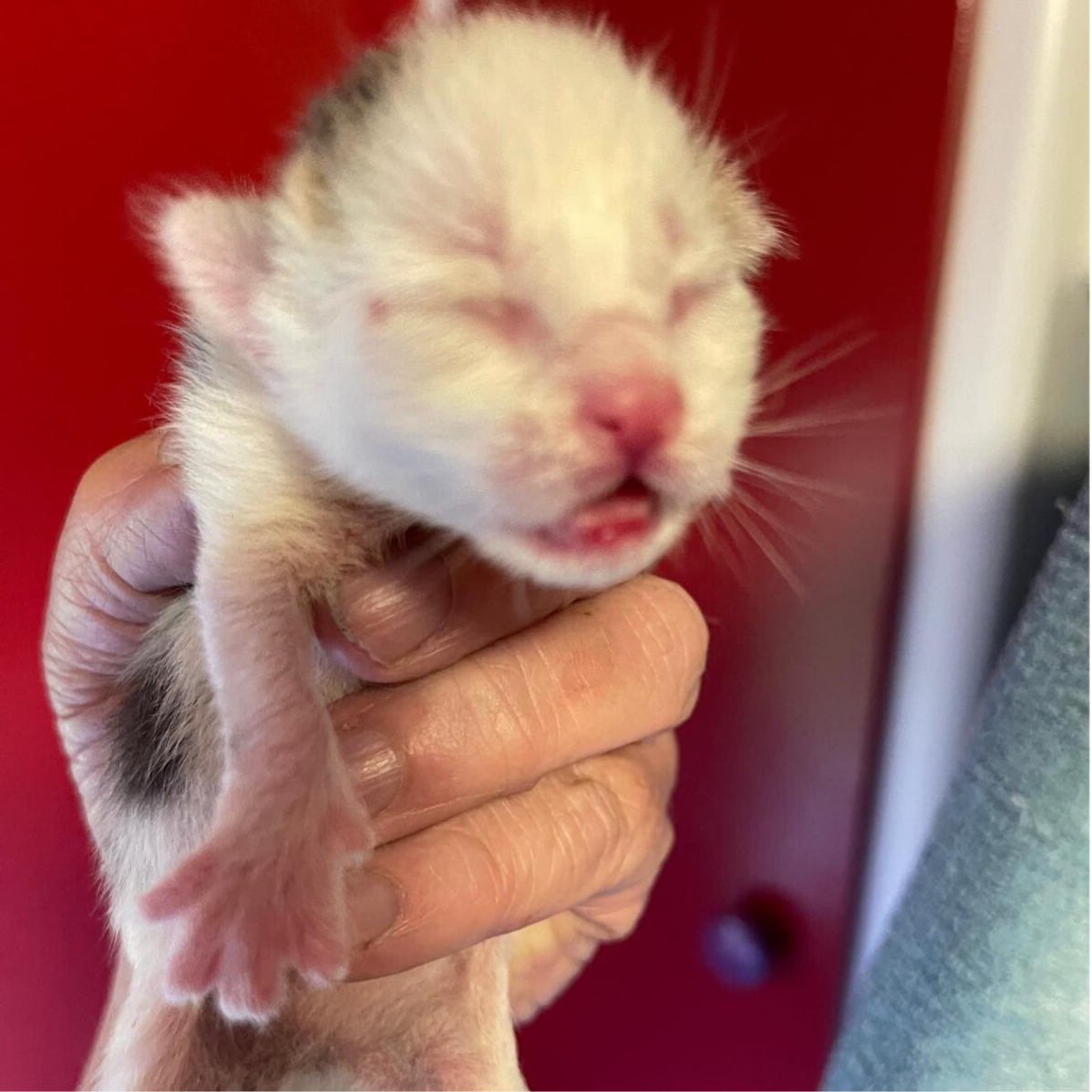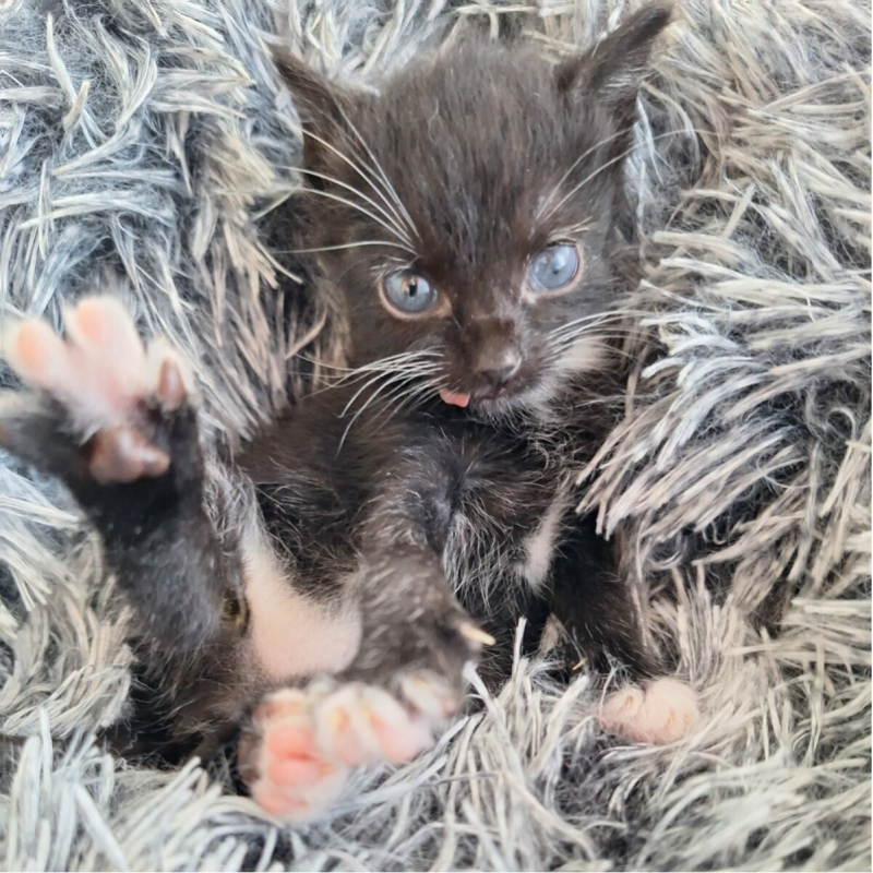 Potato kwam bij ons, omdat zijn moeder hem links liet liggen. Potato is een bijzonder kitten, hij heeft geen zuigreflex, dat wil zeggen, dat hij per sonde gevoed moet worden. Meestal komt dit na enkele dagen goed, maar bij Potato niet. Gelukkig heeft hij nu ook door hoe uit een spuitje kan drinken. Slikken kan hij gelukkig wel. Hij houdt zijn tongetje ook niet normaal. Ook is hij waarschijnlijk blind. We weten niet wat de toekomst voor hem brengt, maar op dit moment is hij happy en zolang dat is, zijn wij dat ook.