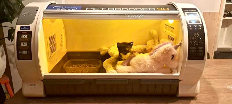 Het zou nog beter zijn, om deze zuurstofconcentrator te gebruiken in combinatie met een hypermoderne couveuse. Wij vroegen maanden geleden daarom om uw hulp. Wij hebben namelijk zeer regelmatig kittens bij ons binnen de stichting, die er vaak heel slecht aan toe zijn. Sommigen hebben het letterlijk benauwd door longworm infecties en/of longontsteking. Sommigen hebben erge bloedarmoede door een hele berg vlooien die het kitten met zich meedraagt. Ook dan worden kittens ernstig benauwd en kunnen daar aan sterven. Soms zijn het verzwakte kittens die door ziek of zeer of ondervoeding extra ondersteuning kunnen gebruiken om zo energie te sparen om simpelweg te zorgen dat ze niet dood gaan. Een moderne couveuse helpt daarbij.